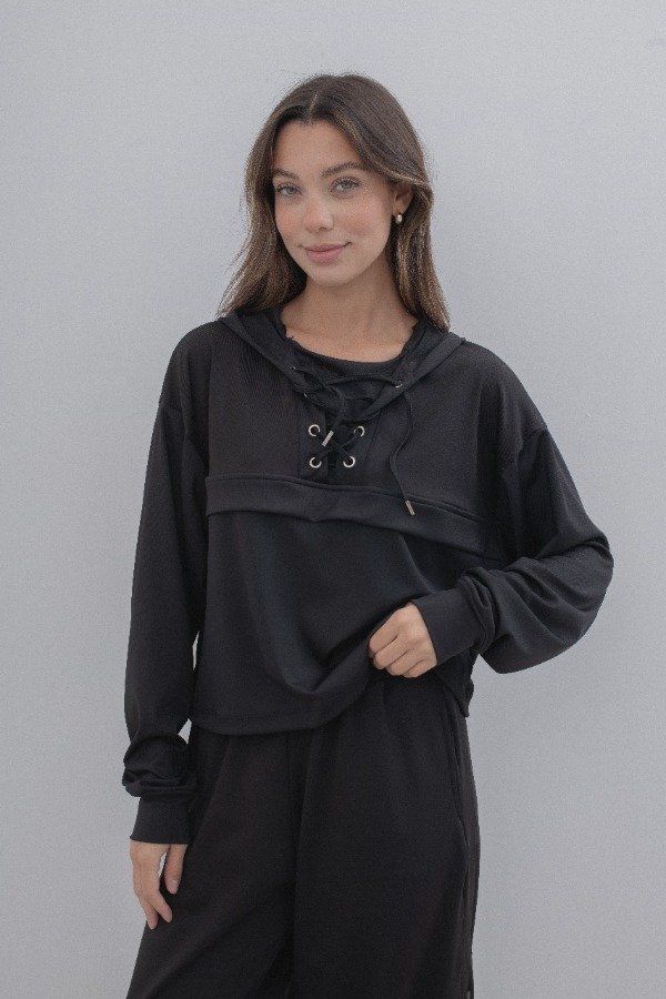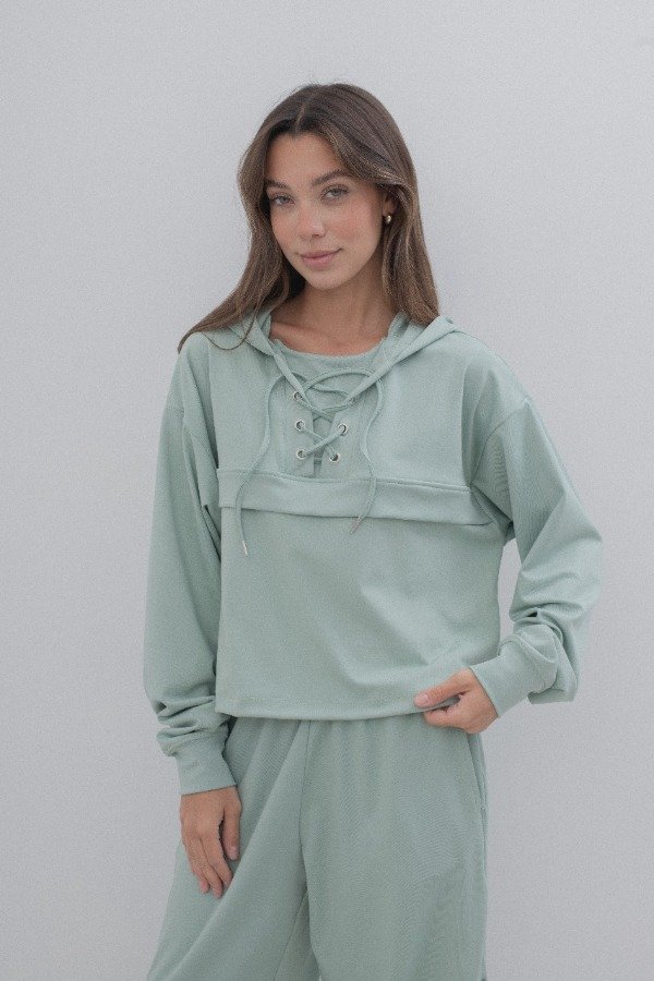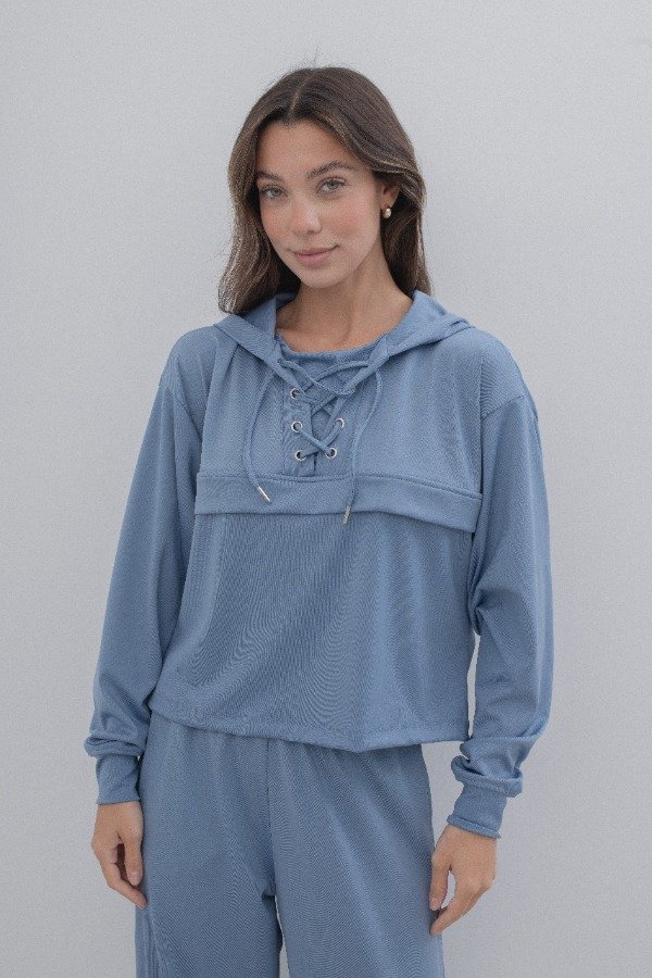 Buzo amplio, con capucha, fuelle en delantero, cartera con ojal metálicos y cordón para cruzar. Tela: Active