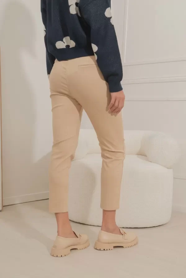 Pantalón de bengalina al cuerpo con recorte delantero y bolsillo ojal en la espalda. Tajo en ruedo delantero.